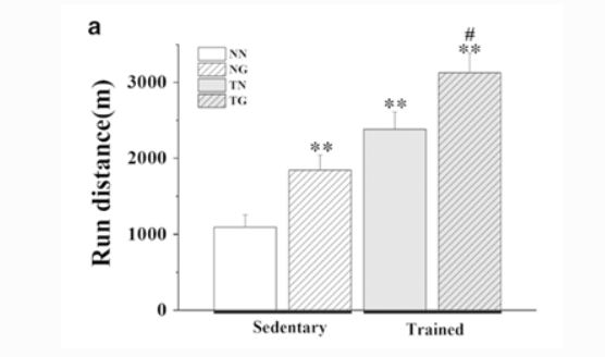 Se puede observar como la mejora en los ratones tanto entrenados como no entrenados es significativa casi doblando la distancia recorrida en ratones no entrenados.